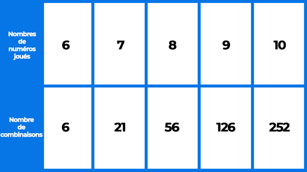 - Combinaison Multiple : choisissez entre 6 et 10 numéros. Le prix de votre grille dépend du nombre de numéros sélectionnés