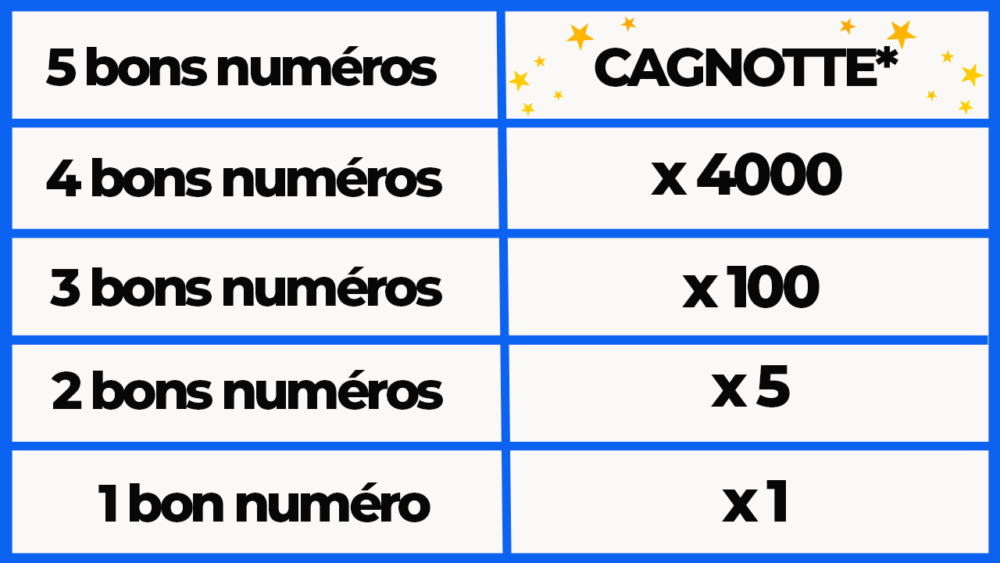 En fonction des résultats du tirage et de votre ticket, votre mise initiale sera multipliée par :